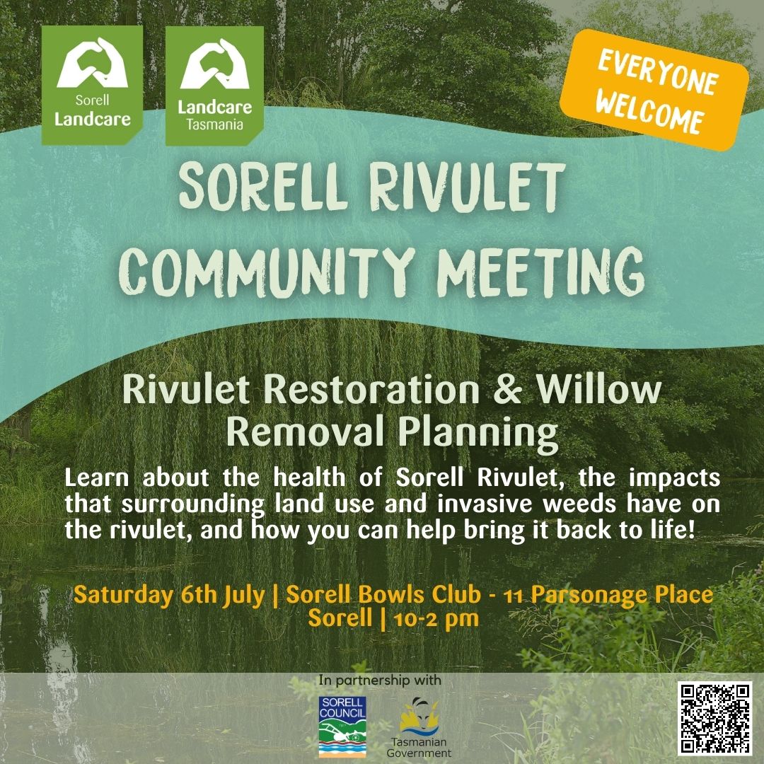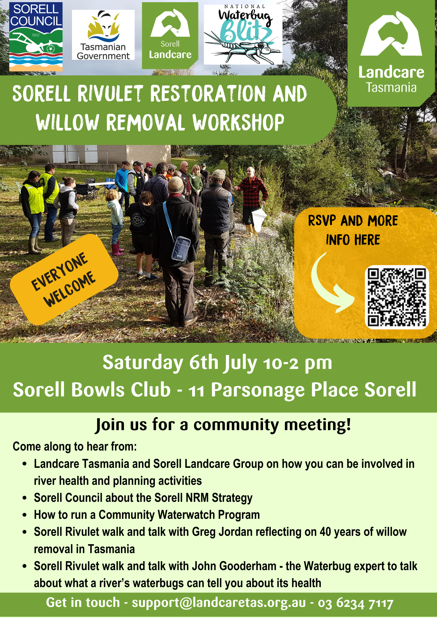 Join us on the 6th of July at the Sorell Bowls Club to learn about the health of Sorell Rivulet, the impacts of surrounding land use and invasive weeds, and how you can help bring it back to life!