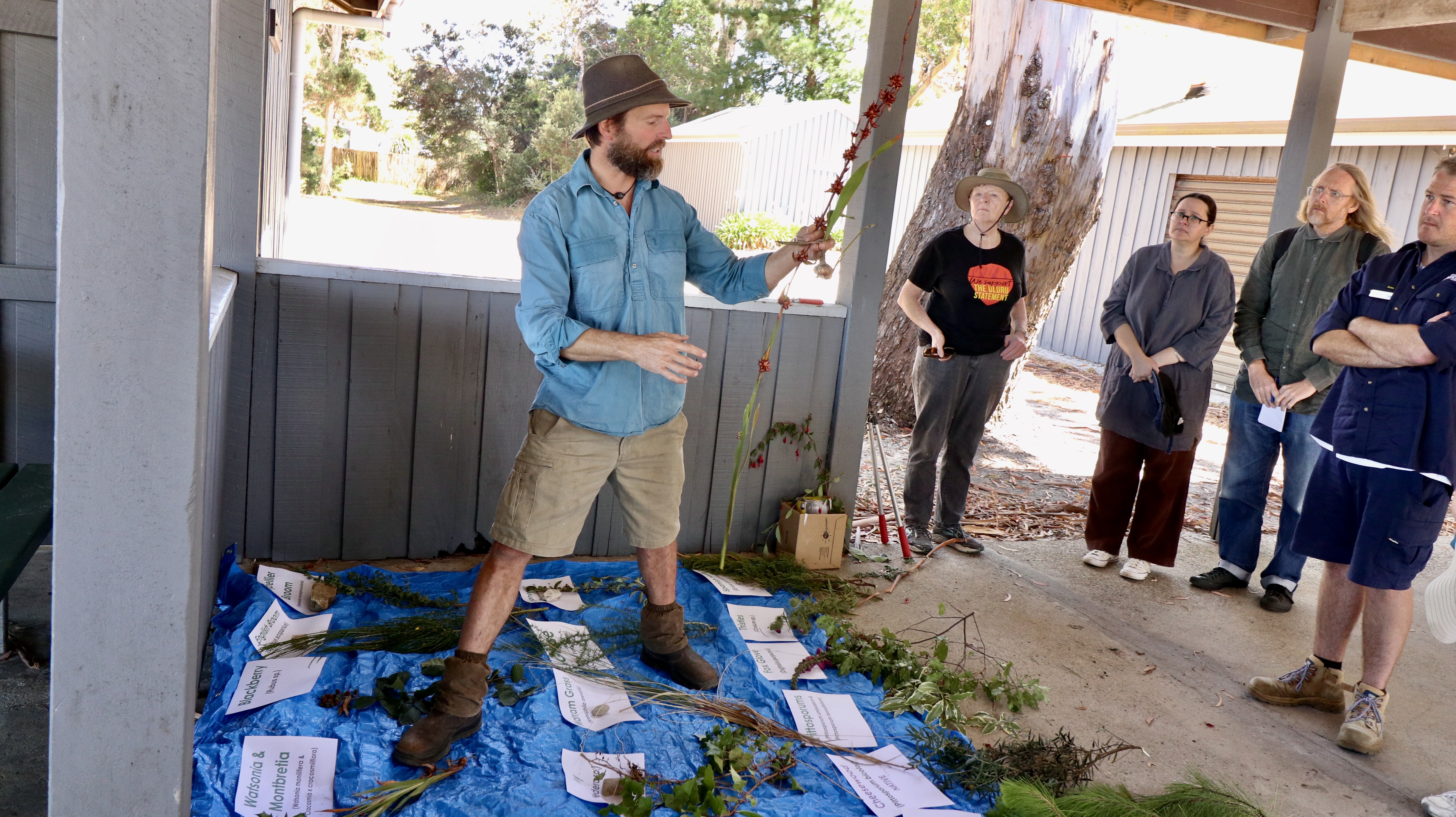 Axel Meiss, a statewide weed contractor, shares his knowledge on weeds found in the Strahan region at a workshop held in February 2025. Photo credit: Landcare Tasmania.
