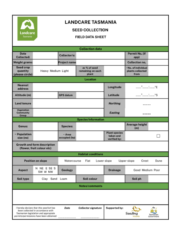 We've developed a new Seed Collection Data Sheet to support best-practice native seed collection and propagation across Tasmania. Based on the FloraBank Guidelines (Module 4 – Record Keeping), this resource will help you ensure seed collection is both legally compliant and aligned with industry best practices. Additionally, accurate record keeping is essential for planting local provenance seed or trialling seed from hotter, drier regions of Tasmania to test for climate change resilience. Developed with funding from the Tasmanian Government and input from Seeding Victoria.