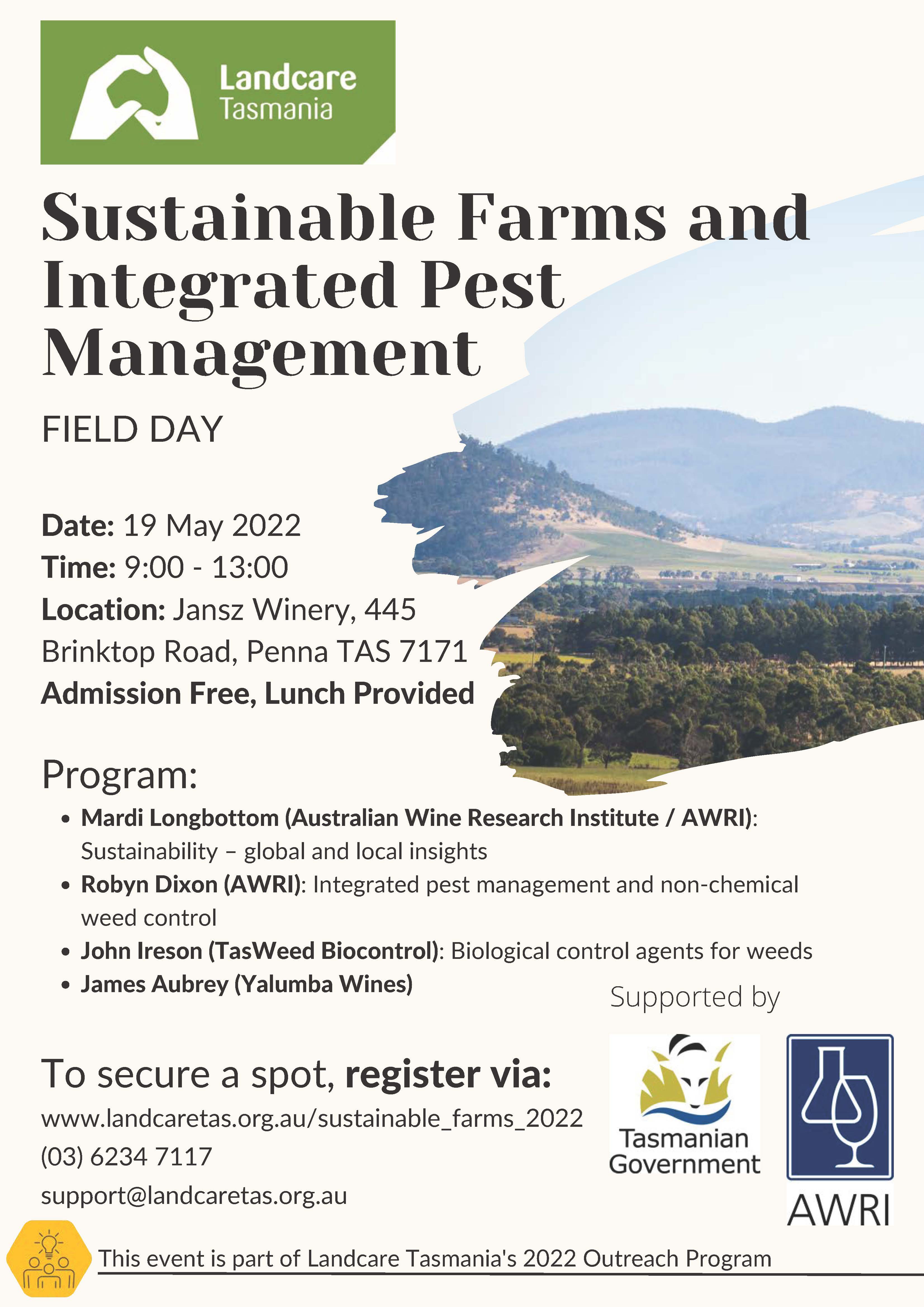 Join Landcare Tasmania for this free field day on sustainability and integrated pest management. The program will provide insights for wine makers, farmers and other landholders.