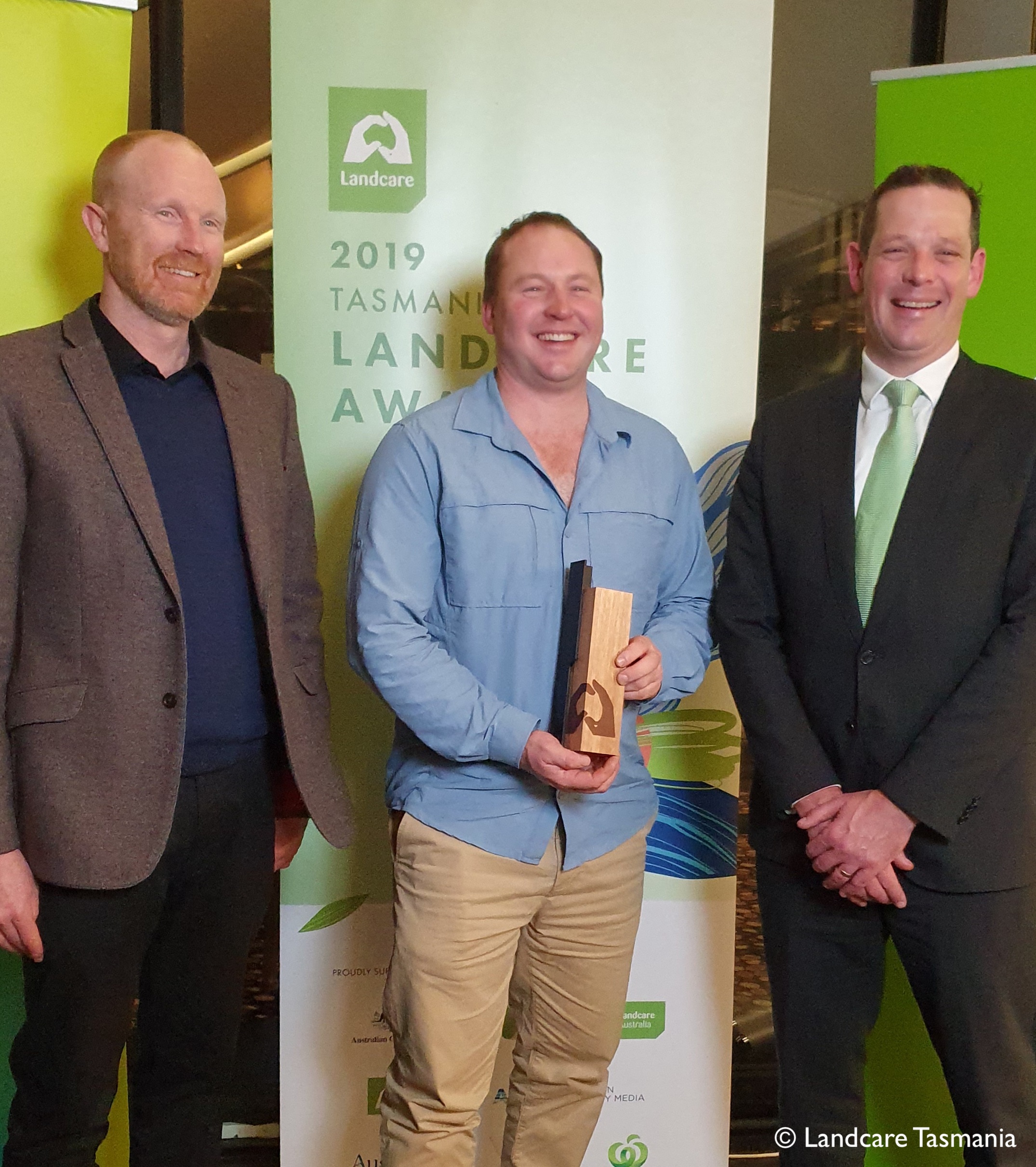Image: Michael Nichols (centre) Accepts the Award, with Landcare Tasmania's Peter Stronach A/CEO (left) and Director Jonathan Lord (right).