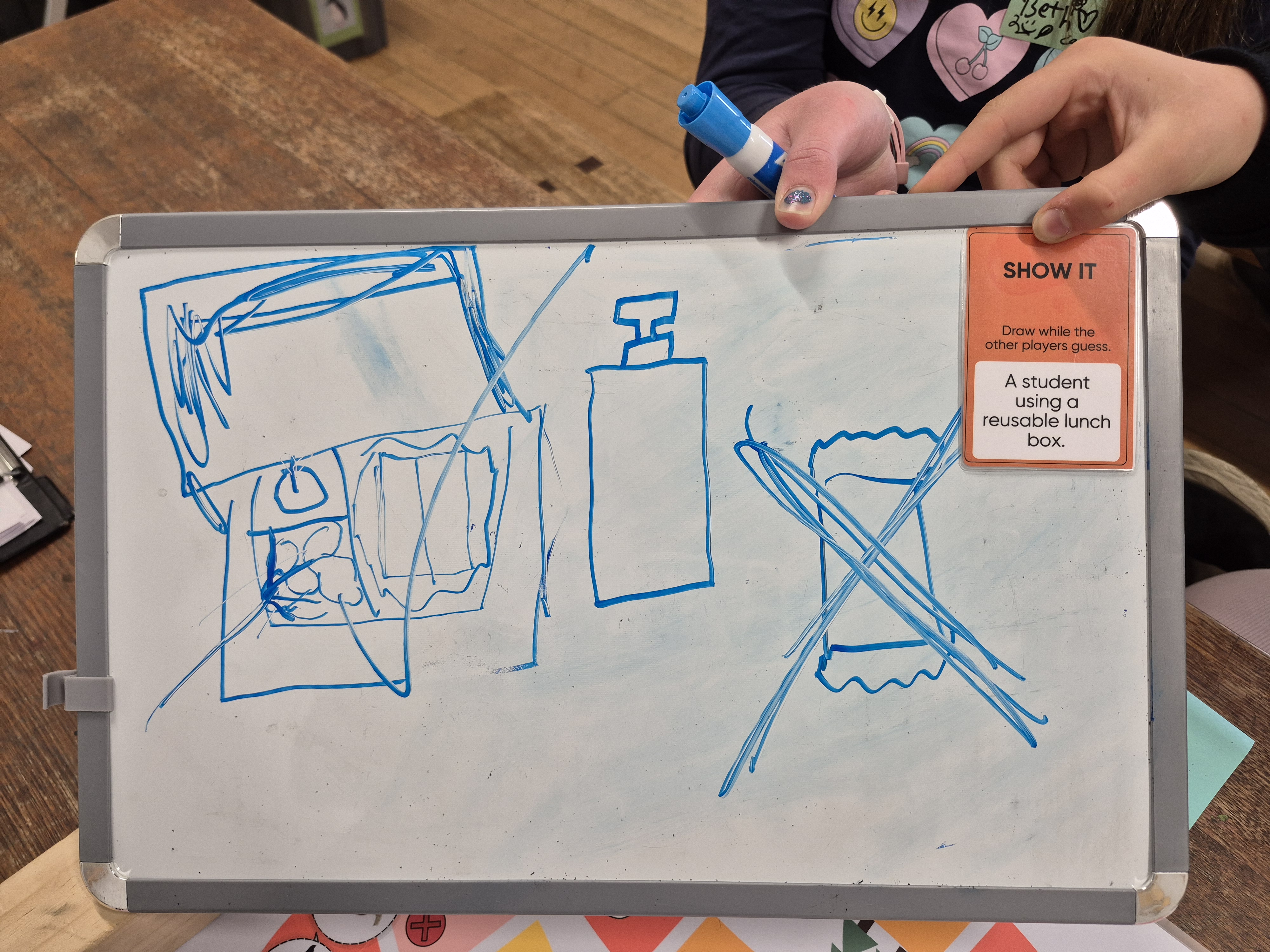 QUICK! How would you draw this card? Here is a fast sketch from the day of a reusable lunchbox with a big tick and some food wrapped in plastic with a big cross. The other children had to guess!